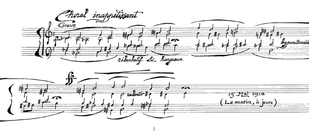 - Eric Satie’s Sports et Divertissements of 1914 shows his eccentric humor at every turn. Print it out here (imslp is a wonderful resource for free public domain classical music): https://imslp.org/wiki/Sports_et_divertissements_(Satie%2C_Erik). The sparse music of his humorous period includes tongue-in-cheek comments such as, “Like a Nightingale with Toothache”, “Light as an egg”, “Open your head”, and “Work it out yourself”.